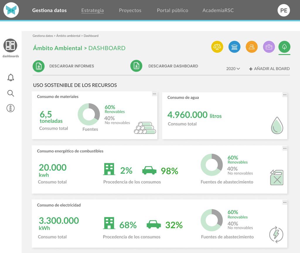 ¿Cómo? Es la propia plataforma la que indica a las empresas qué información deben añadir bien a través de conexiones API o bien mediante la introducción de datos en un formato que se descarga en la propia interface. Por ejemplo, la conformación de la plantilla, consumos de electricidad y agua, residuos y desechos, salarios, etc. De esta forma, el sistema lee la información y calcula, automáticamente, los indicadores más relevantes.