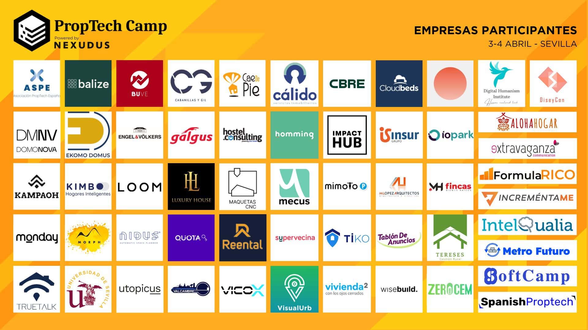 Durante los días 3 y 4 de abril, Sevilla se convierte en el núcleo de la innovación tecnológica en el sector inmobiliario con la celebración de «PropTech Camp Sevilla, Powered by NEXUDUS». Este evento sin precedentes reúne a líderes, empresarios, innovadores y emprendedores del sector del Property Technology (Tecnología aplicada a los bienes inmuebles) para explorar y discutir las últimas tendencias, desafíos y oportunidades que están moldeando el futuro de la construcción, la domótica, la inmobiliaria, el software de gestión y mucho más.